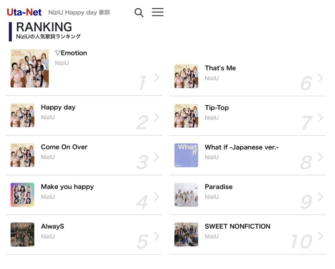 NiziUの人気歌詞ランキング🌈 🥇♡Emotion uta-net.com/song/381925/ ___________ 💿アルバム歌詞一覧 uta-net.com/album/ESCL-614… 🌈ユニット uta-net.com/song/383763/ uta-net.com/song/383762/ uta-net.com/song/383761/ #NiziU #NiziU_NewEmotion #NiziU_ෆEmotion #にゅーえも #らぶえも