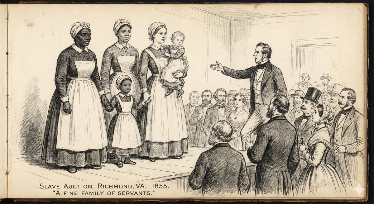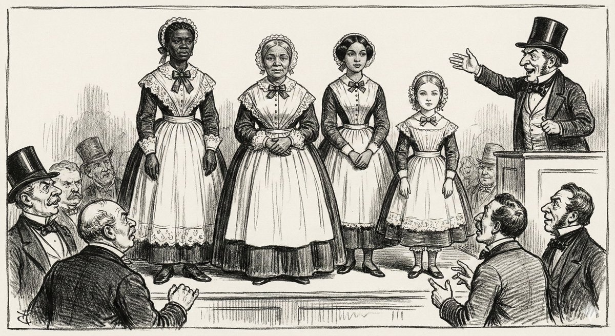 アメリカの家事奴隷オークション 屋敷内の主人家や監督など白人男からの強制的な性交渉のため、世代が下るにつれて白くなる家奴隷の一家 #slavery #bondmaids #houseslave #america #AIillustration #caricature #風刺画 #AIイラスト pic.x.com/sARLwM4Jnb