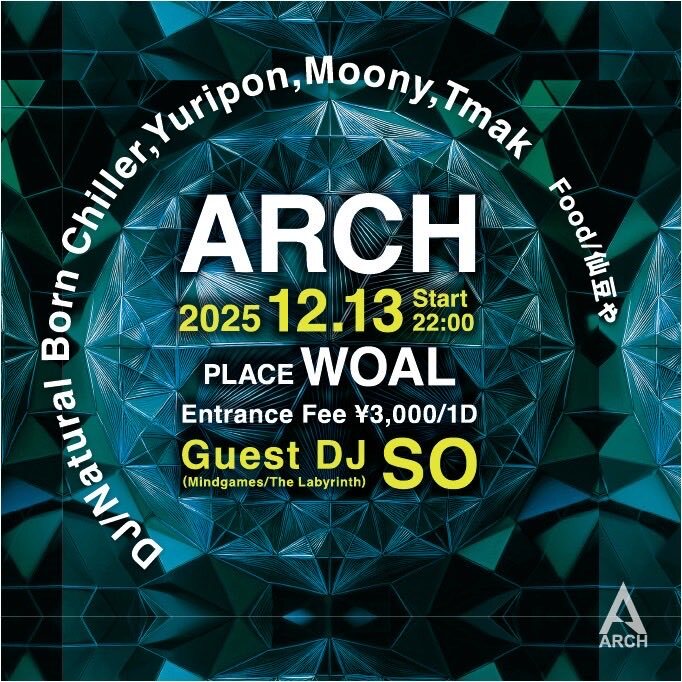 毎度ありがとうございます。 12/13(SAT) ARCH GUEST DJ:SO(Mindgames/The Labyrinth) DJ:Natural Born Chiller, Yuripon, Moony, Tmak FOOD:仙豆や OPEN 22:00 DOOR 3000yen/1D #ARCH pic.x.com/xR8m5kmMq1