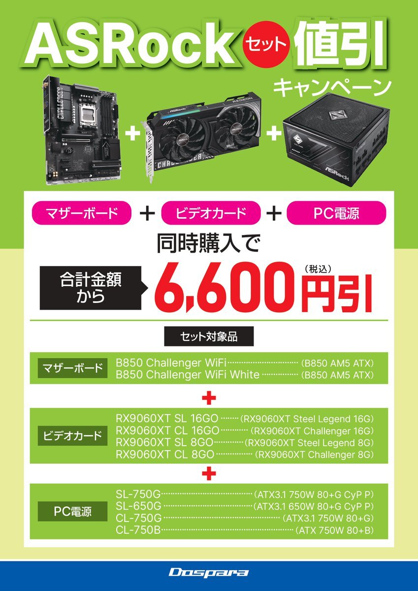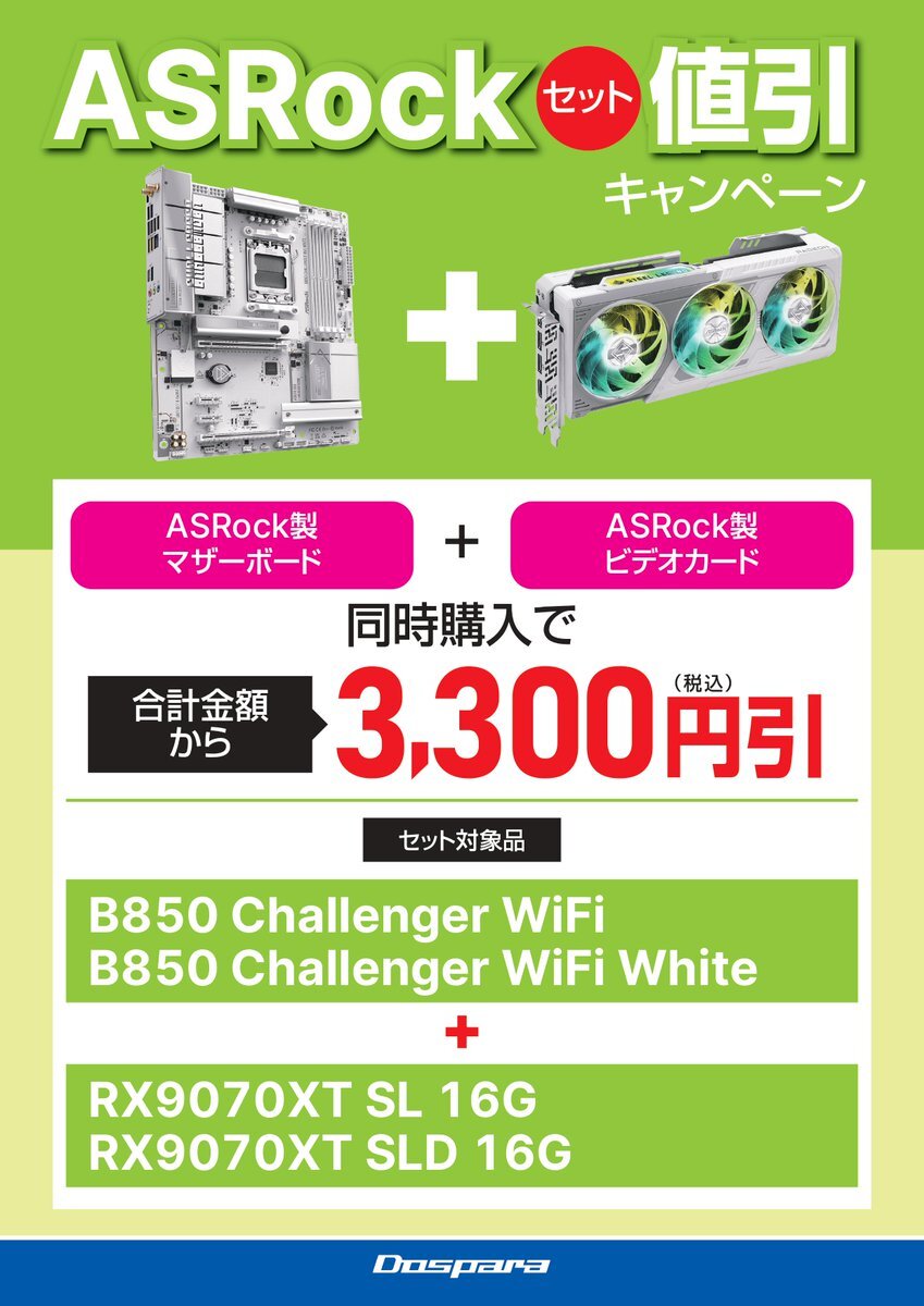 📢<お買い得情報❗ #ASRock セット値引きキャンペーン実施中👀💚 マザーボードはドスパラ限定のChallengerが対象!🦾 一部モデルは展示もあって実際に見てから購入も出来ます☺️ ご相談からでもお気軽に😉 ドスパラ津ラッツ店へ是非ご来店ください❗ #PCパーツ #ドスパラ #自作 pic.x.com/1Mc8Rc9dZm