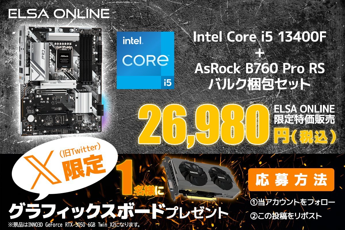【限定特価販売】 ELSA ONLINEにて #CPU と #マザーボード の バルクセットを特別価格で販売します🚀 Intel Core i5 13400F + AsRock B760 Pro RS 26,980円税込み shop.elsa-jp.jp/view/item/0000… 同時にX限定 #プレゼントキャンペーン も開催🔥 簡単応募で当選者に #RTX3050 をプレゼント🎁 ■簡単応募