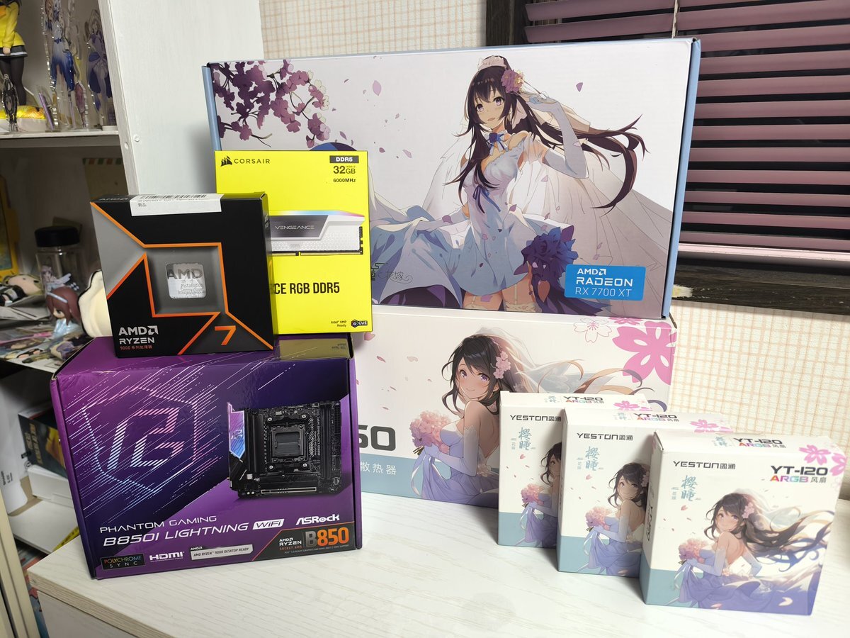 壊れたのでアップデート。花嫁PCです。 CPU:Ryzen7 7700X マザボ:ASRock B850I LIGHTNING WiFi メモリ:VENGEANCE RGB DDR5-6000 32GB グラボ:YESTON Radeon RX7700XT 櫻瞳花嫁 クーラー:YESTON YT-360 櫻瞳花嫁 ファン:YESTON YT-120 櫻瞳花嫁 @YestonOfficial @AsrockJ #yeston #AMD #ASRock #自作PC pic.x.com/OknxjuM3Vt