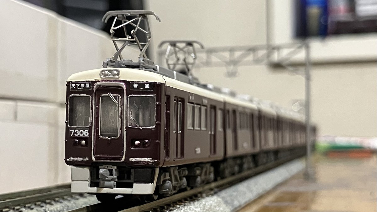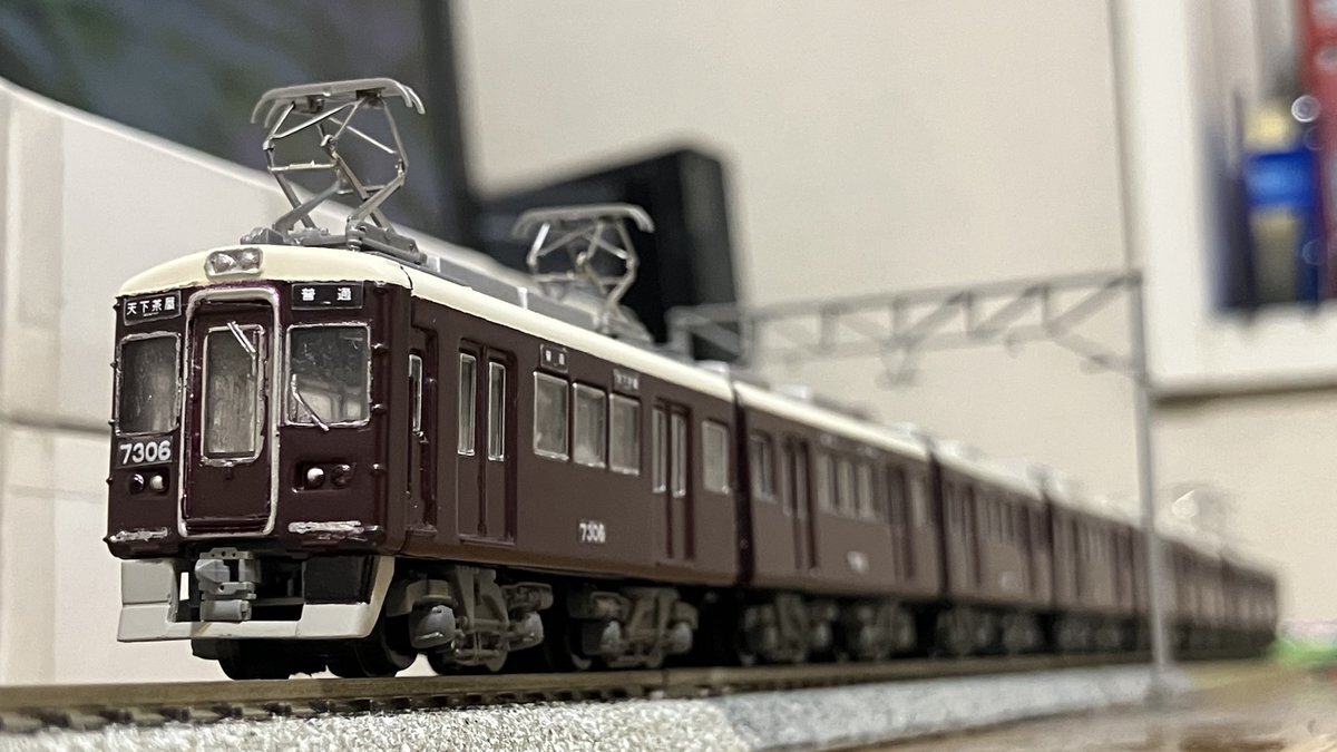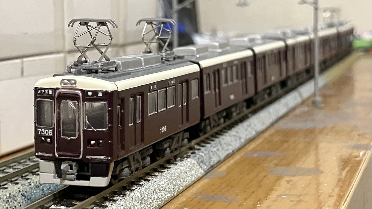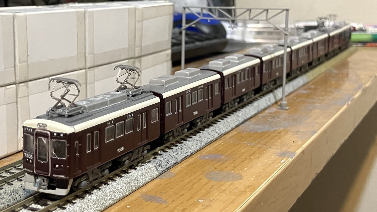 #Bトレ #ショーティーは不滅なり Bトレ改造 阪急7300系リニューアル車 8両フル編成 完成!🎉 前面扉の窓が拡大されたVVVFインバーター制御車が、ついに我が家のコレクションに仲間入り!今まで培ってきた技術で、製品化されていない前面も作りました!(加工内容はリプ欄に) pic.x.com/JP2KAJ6Ycd