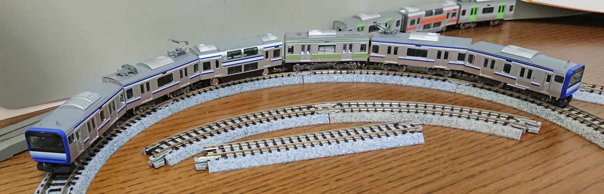 #鉄コレポケット N化 (5) 続き 外周R183 内周R150 約600mm×600mm で試走 ◆動画左 苦肉の策 鉄鉄鉄Bm鉄鉄 T車鉄5+M車(4両目)B1 6両 ◆動画右 遊び 鉄B鉄B鉄Bm鉄B鉄 T車鉄5+M車(6両目)B1+T車B3 9両 ※G車台車は #Bトレ T改 レリーフなし pic.x.com/SzPnyDLLl3