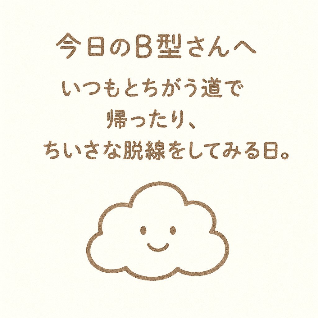 今日のB型さんへ ☁️ いつもとちがう道で帰ったり、ふと気になった店に寄り道してみる日。 ちいさな脱線が、今のあなたにちょうどいい刺激を連れてくる。 私は、自由にコースアウトしていくB型さんを応援したい。 #雲の占い #B型 pic.x.com/GA5vllXDCl