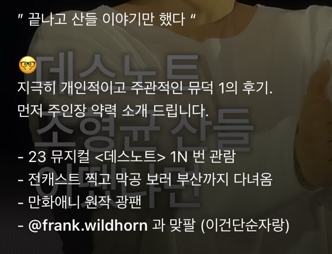 23년 데스노트 1N번 관람하고 데스노트 작곡가인 프랭크 와일드혼과 맞팔인 한 뮤덕의 후기 1. 산들엘 잘한다. 2. 엘이 진짜 어렵고 까다로운 롤인데 3. 그걸 본인만의 해석과 실력으로 맛깔스럽게 살려냄 4. 우선 이미지 싱크가 좋음. 5. 소년미, 선한 눈망울이 엘이랑 찰떡이어서 몰입 개잘댐ㅎ 6.