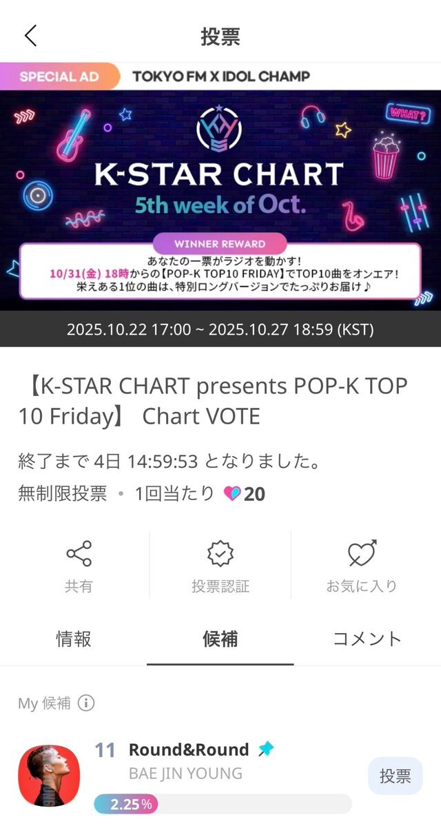 📍 (K-STAR CHART presents POP-K TOP 10 Friday) チャート投票のご案内 IDOL CHAMPにて投票可能 2025.10.27 18:59まで 投票と沢山の関心よろしくお願いします🧸 #배진영 #ペジニョン #BAEJINYOUNG #裴珍映 pic.x.com/1V72hBp98H