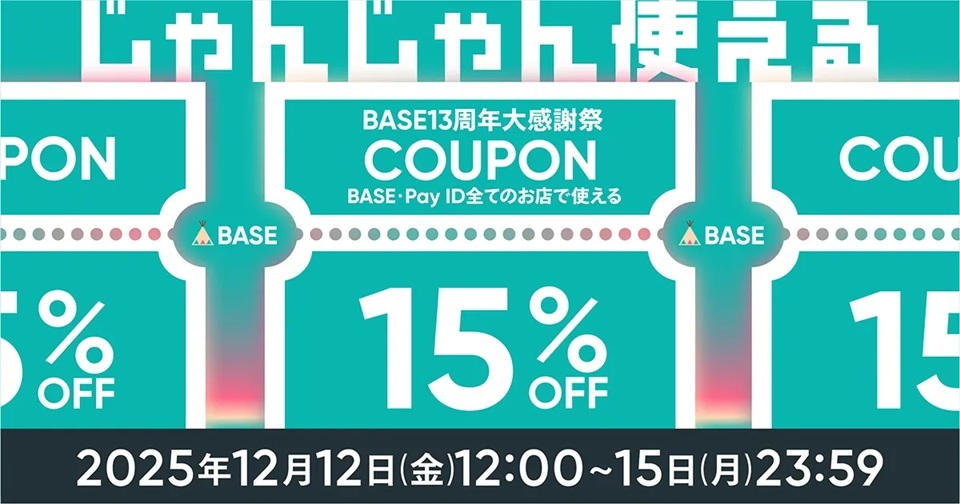 🏕️BASE( ᐛ )⛺️ #BASE感謝祭 / ㊗️BASE13周年大感謝祭㊗️ 15%OFFクーポンキャンペーン \ 開催決定🎉 ⏰クーポン利用可能期間⏰ 12月12日(金)12:00~15日(月)23:59 🎫クーポンコード🎫 【2512base】 詳細は以下の記事よりチェック✔️ baseu.jp/47239