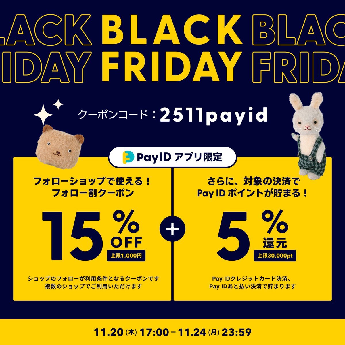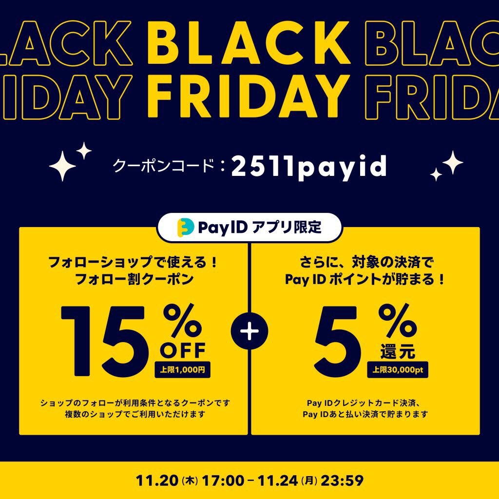 お知らせ⋆͛📢⋆ BASEでお得なキャンペーンが始まります。ぜひ、ご活用ください! 詳細情報や注意事項は2枚目以降をご確認ください。 ▼キャンペーン期間 2025年11月20日(木)17:00〜24日(月)23:59 ▼クーポンコード 2511payid charabuki.base.shop #PayIDブラックフライデー