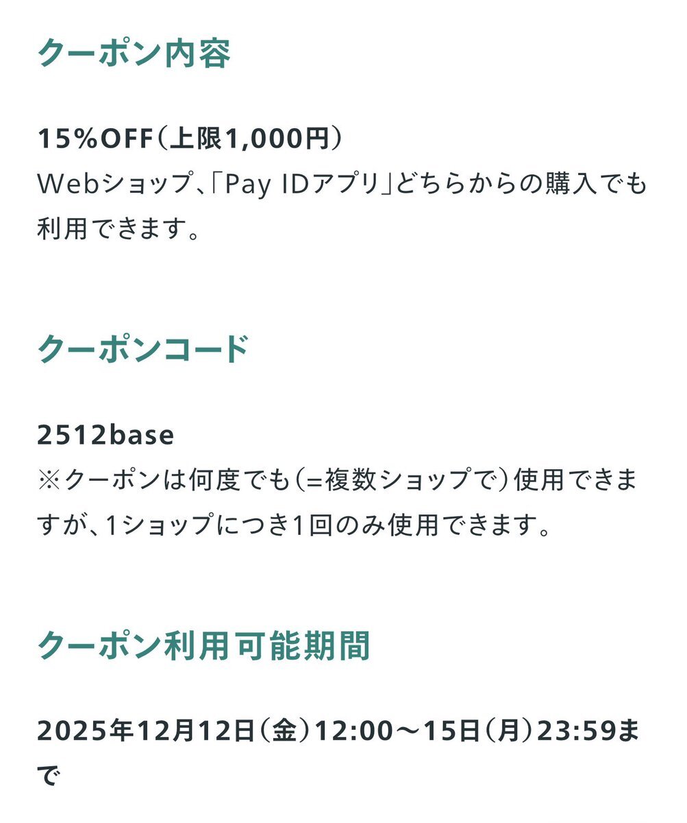 \🏮BASE 13周年大感謝祭🏮/ 全てのショップでご利用いただける 15%OFF(上限1,000円)クーポンをプレゼント! ⏰ クーポン利用可能期間 12月12日(金)12:00 ~ 15日(月)23:59 「Pay IDアプリ」で気になるアイテムに♡しておいてくださいね! to.payid.jp/N4L9/v94ci1ov