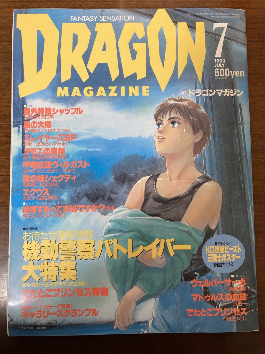 『ドラゴンマガジン1993年7月号』 劇場版パトレイバー2・特集。 高田明美先生の描き下ろし多数。個人的にいちばんの注目は、第二小隊から転属後、「神奈川県警レイバー隊隊長となった熊耳さんの勇姿」。 #パトレイバー
