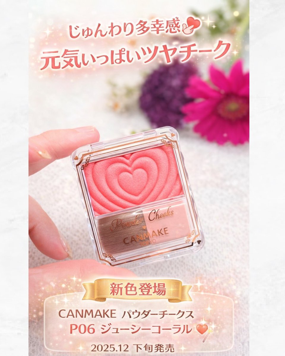 キャンメイク新イメージモデルに原菜乃華さんが就任🎉 一緒に魅力をお伝えしていきます♪ / あのパウダーチークスに新色登場✨ \ 今回の新色P06ジューシーコーラルは、 果汁のようにジューシーで 大人っぽく仕上がるコーラルカラー❤ キュキュンとときめくツヤほっぺに💕 チェックしてみてね♪