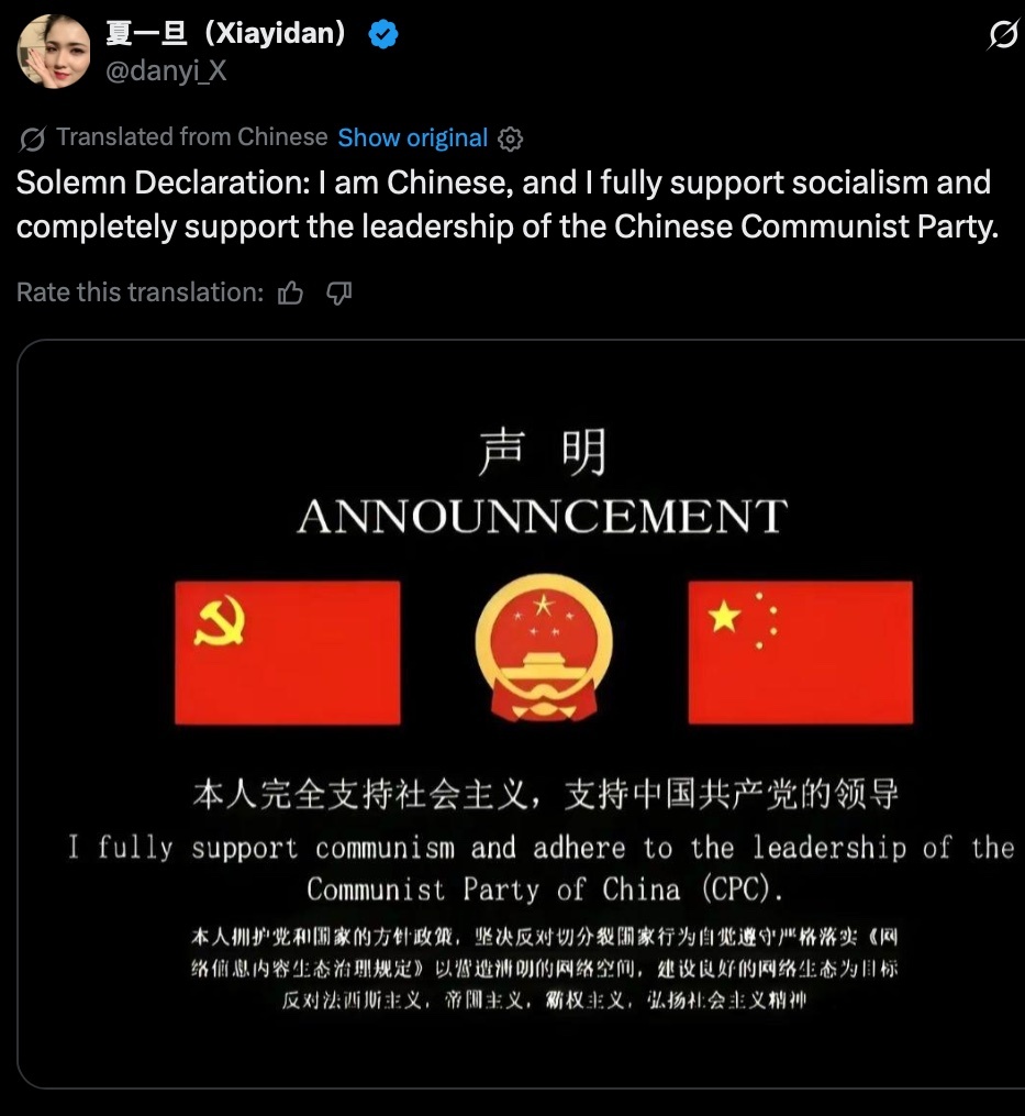 China's new psyop, force the drones to post this copy paste nonsense on our platform. Imagine we all went to Weibo and posted "I stand for democracy and free speech" or some such, we'd all be banned in a heartbeat. This nonsense makes me sick