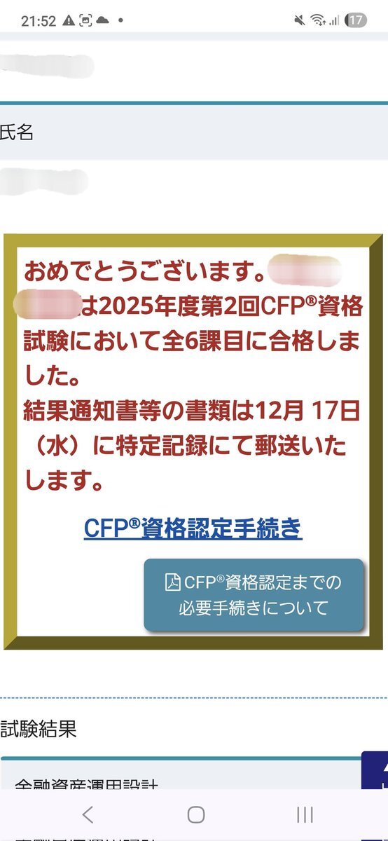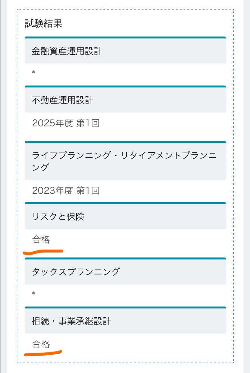 報告が遅れました🙇 金融が合格し🈴これでCFP全6科目合格となりました👍 50代半ば中年男の挑戦! ひと言では語り尽くせない…非常に感慨深いものがあります 言えるのはXでの資格取得に励む同志の刺激があったからこそです 皆さんに感謝いたします🙇 #CFP pic.x.com/0yuTMxZP6D