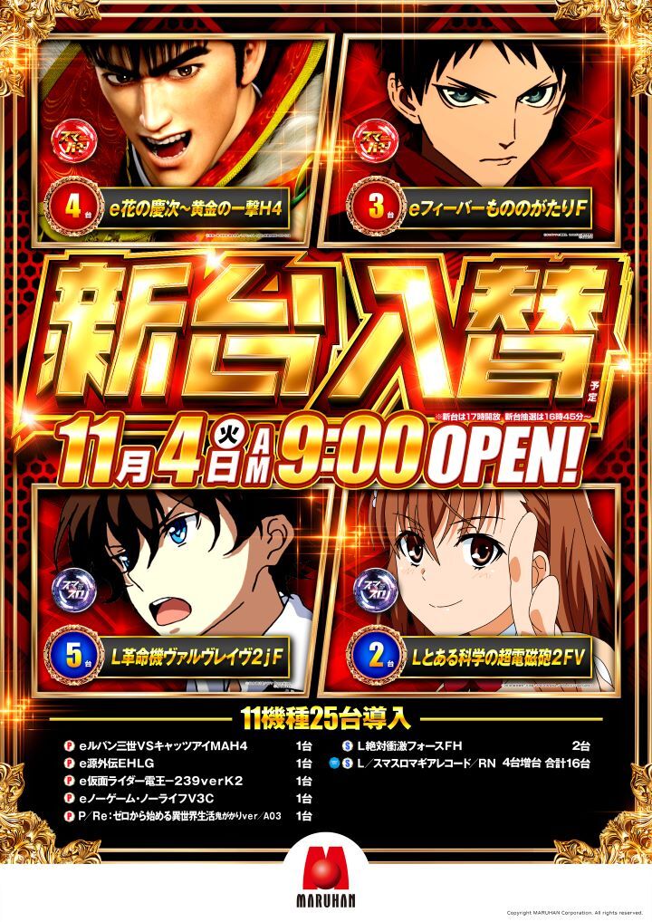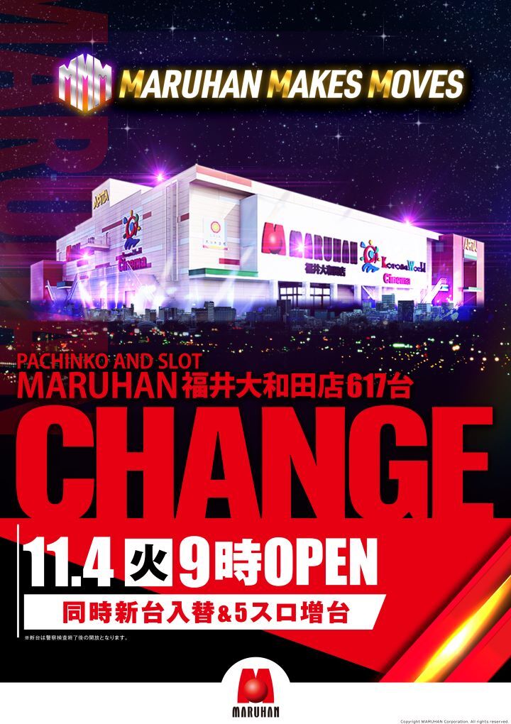 おつイオリん💗 あれあれ? 福井大和田店が何かざわざわしてるの〜💫 ニャンギラスの次は...  チェンジ!?😳✨ なになに〜? 新台入替&5円スロット増台だって〜✨ 11月4日(火)朝9時オープン🍭 新台は17時からだよー♬ みんな〜🌟遊びにきてねっ🌈 #新台入替 #CHANGE #変わる pic.x.com/YkRFJNe8md