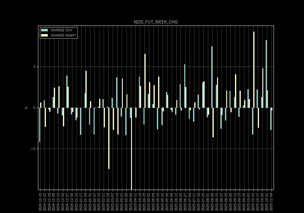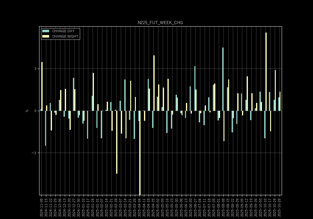 日経先物:10/28 前日引-寄-引 50590円/50560円/50460円 変化 夜間/昼 -0.06%/-0.20% 週間累積変化 夜間/昼 +1.35%/+0.94% #日経平均 #CHANGE #WEEK pic.x.com/Zp0MtqvW70