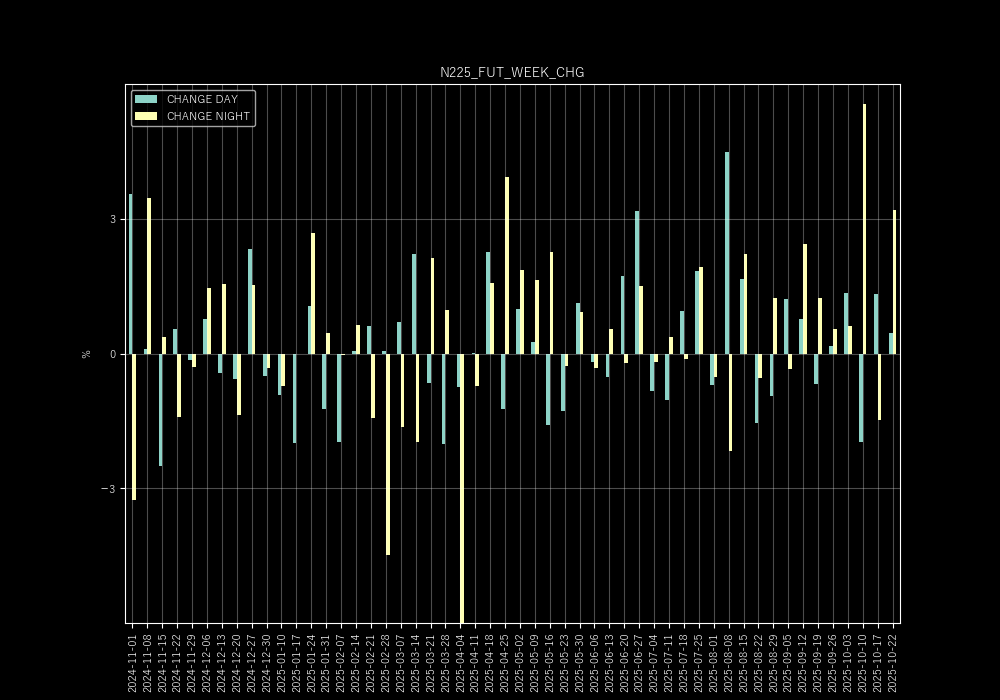 日経先物:10/22 前日引-寄-引 49150円/49340円/49310円 変化 夜間/昼 +0.39%/-0.06% 週間累積変化 夜間/昼 +3.19%/+0.45% #日経平均 #CHANGE #WEEK pic.x.com/OLxrs6VOKd
