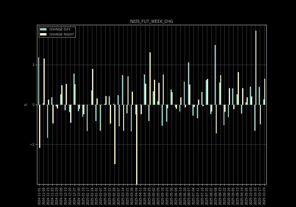 日経先物:10/24 前日引-寄-引 48670円/49130円/49320円 変化 夜間/昼 +0.94%/+0.39% 週間累積変化 夜間/昼 +2.88%/+0.77% #日経平均 #CHANGE #WEEK pic.x.com/So14Sd2P5D