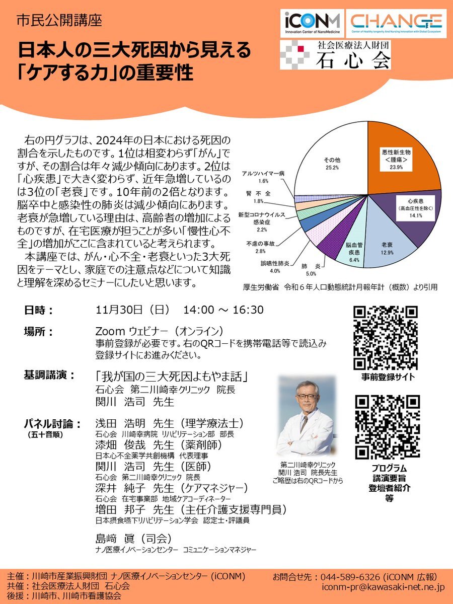 11/30 (日) 午後2時からオンラインにて市民公開講座を行います。参加費無料。誰もがケアする、ケアされる時代に備えましょう。#iconm #CHANGE #石心会 pic.x.com/uISvbx3QKG