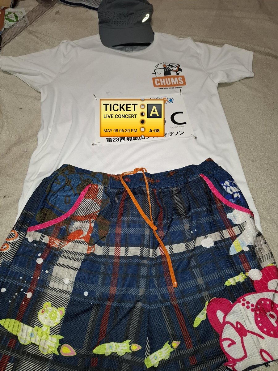 明日の #和歌山ジャズマラソン これで参戦です。 壱軸T考えたけどゼッケンがロゴに被っちゃうので今回は諦めました💦 という事で #CHUMS& #URM のコラボTで走ります✨ 明日出発が早いのでそろそろ休みます🌙*゚ pic.x.com/P9Sx16a2FY