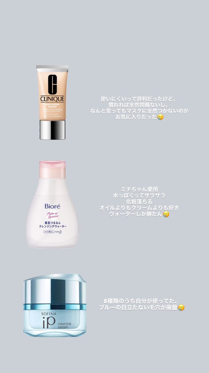 自分が使っていたものがことごとく廃盤になるのなーぜ?🥲 特にファンデーションと化粧落とし大好きだった!!復活してくださいお願いします!! #ビオレ #素肌つるるんクレンジングウォーター #クリニーク #clinique pic.x.com/XdUHJanjMm