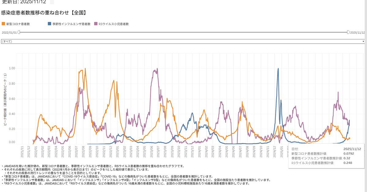 #新型コロナ #covid19 #季節性インフルエンザ 2025年11月12日 Moderna製薬発表 リアルタイム流行疫学情報 ・新型コロナウイルス ・RSウイルス ・流行性インフルエンザ ⇒急拡大 moderna-epi-report.jp pic.x.com/WydS0TZrMO