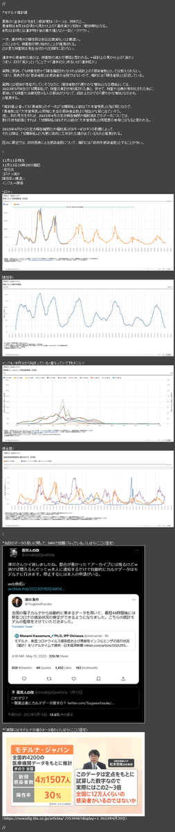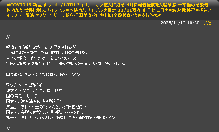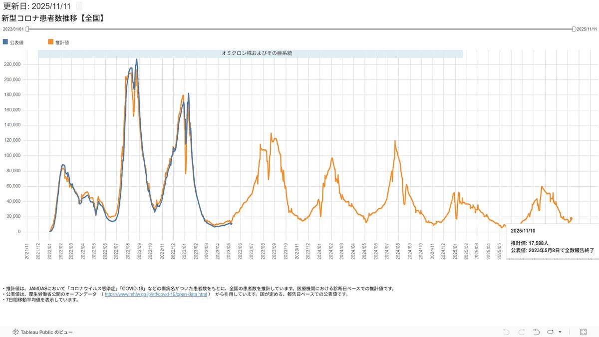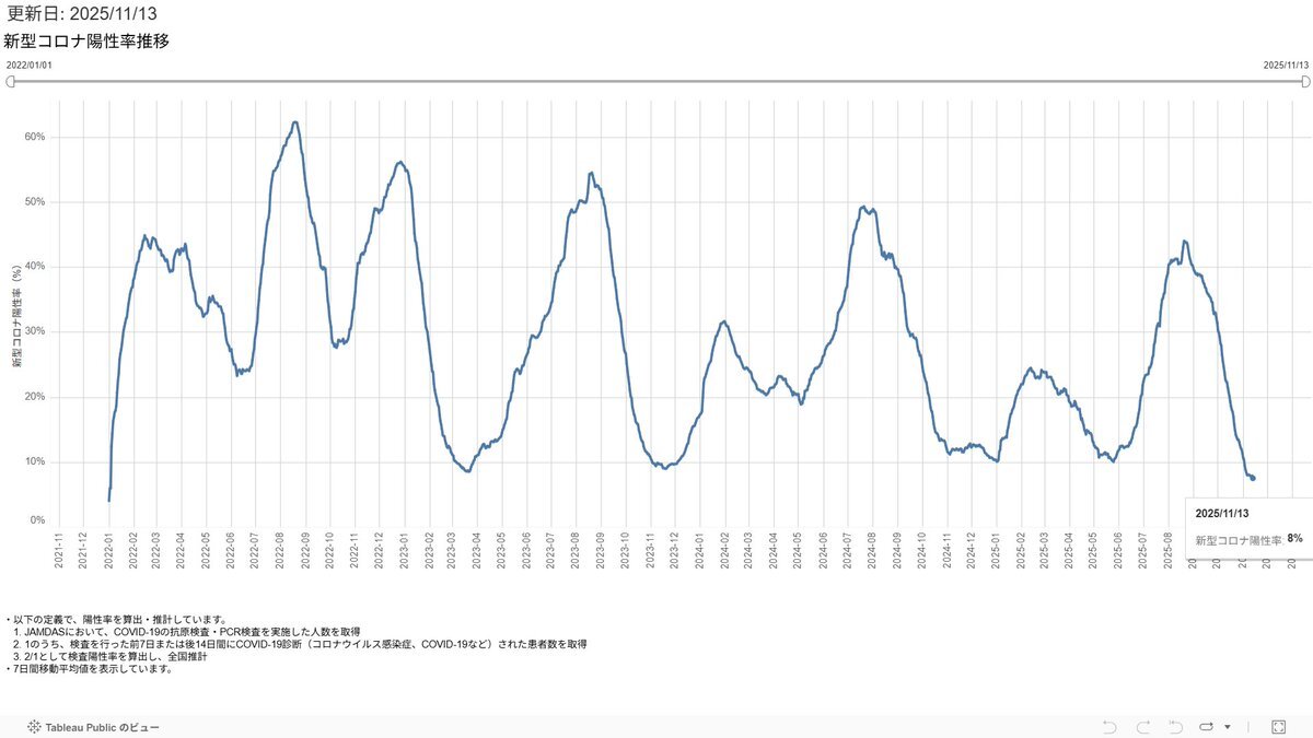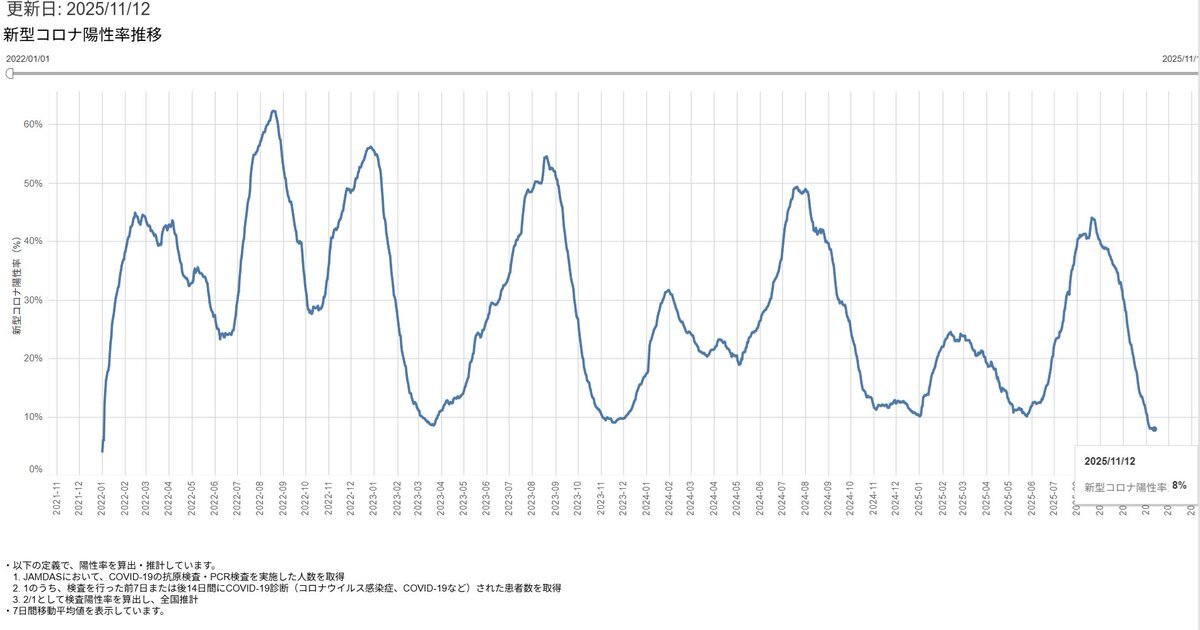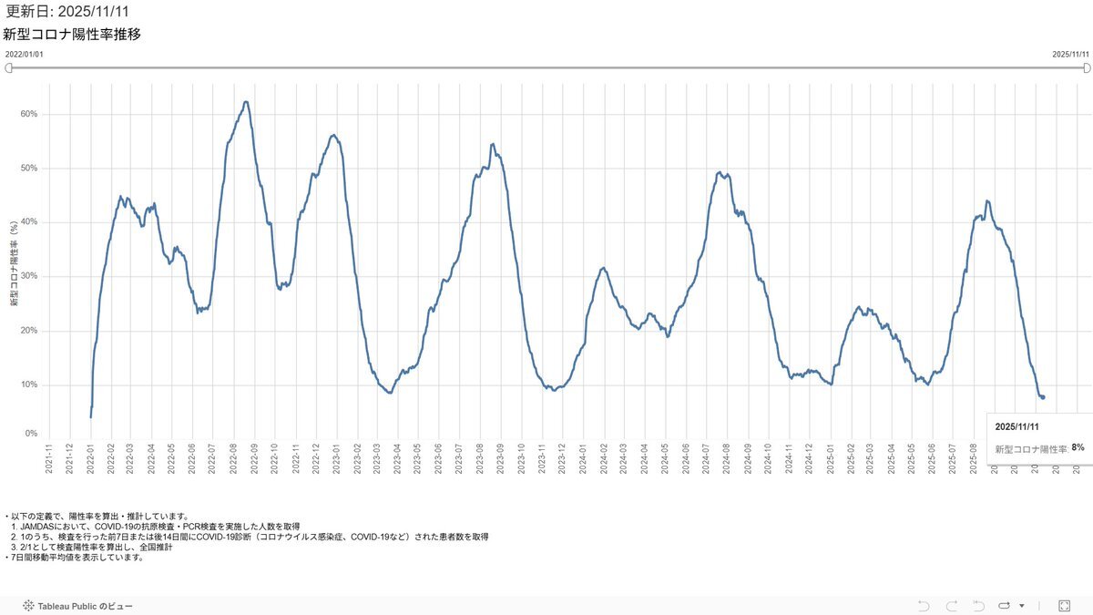 【徒然4】【#COVID19 新型コロナ 11/13TH *コロナ=冬季拡大に注意 4月に報告機関を大幅削減 →本当の感染者数増加や慢性化懸念 *インフル=本格増加 *モデルナ推計 11/11現在 前日比 コロナ=減少 陽性率=横這い インフル=微減 *国が直接に無料の全数検査・治療を行うべき】 juubeeysd.blog.fc2.com/blog-entry-855… pic.x.com/qLCRwognwE