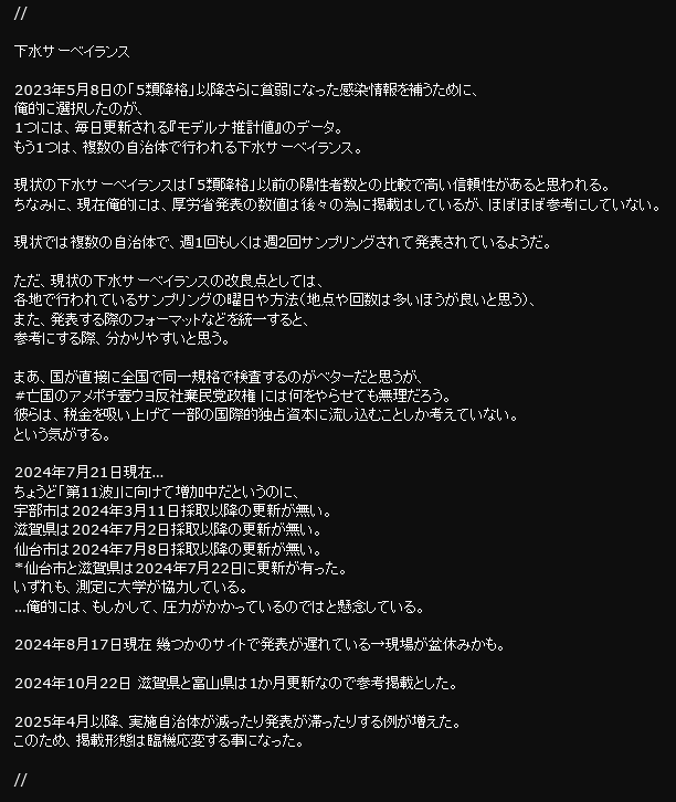 #COVID19 新型コロナ 慢性化の懸念 2025/04/20 2025/05/31加筆 年度替わり以降、下水サーベイを終了する自治体がちらほら現れているので俺的にはちょっと心配している 更に政府は4月から定点報告機関を大幅削減(約5千→約3千) その結果、本当の感染者数の更なる増加と慢性化への懸念が強まると思う pic.x.com/j7BYR6EA9p