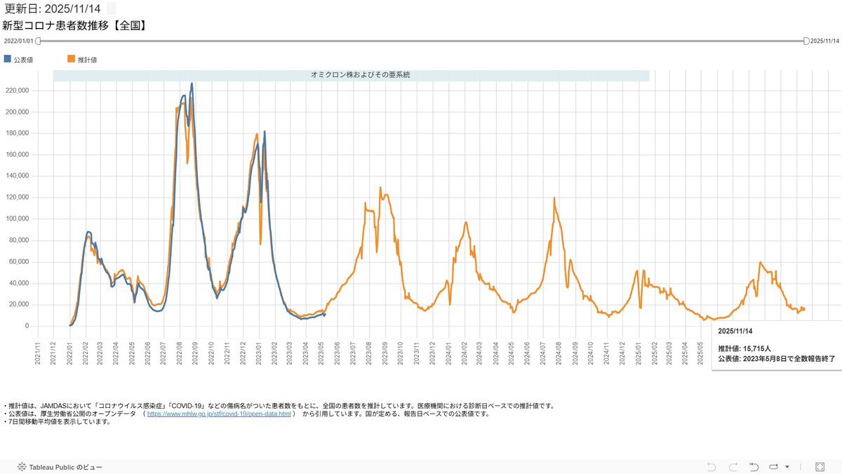 【徒然4】【#COVID19 新型コロナ 11/15SA *コロナ=冬季拡大に注意 4月に報告機関を大幅削減 →本当の感染者数増加や慢性化懸念 *インフル=本格増加 *モデルナ推計 11/13現在 前日比 コロナ=微減 陽性率=横這い インフル=増加 *国が直接に無料の全数検査・治療を行うべき】 juubeeysd.blog.fc2.com/blog-entry-860… pic.x.com/YzekVOguYS