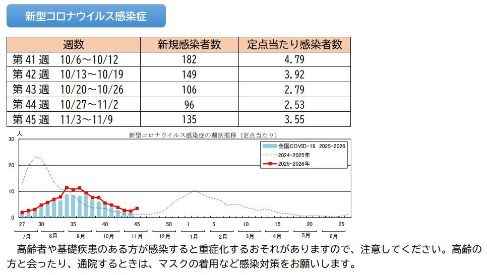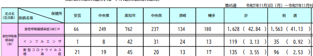 #COVID19 #高知 11/13発表 【第45週11/3-11/9】 新規感染 135 ◁前週比 +39 +40.62%超… 感染者/定点 3.55 ◁中央西 4.25… ❝安芸で急増、高知市、中央東、幡多で増加❞… ◁高知県感染症発生動向調査(週報) pref.kochi.lg.jp/doc/2025011000… pic.x.com/wvLlTwXgqH