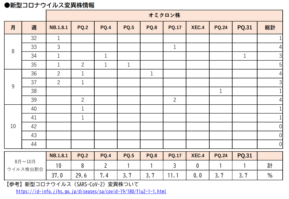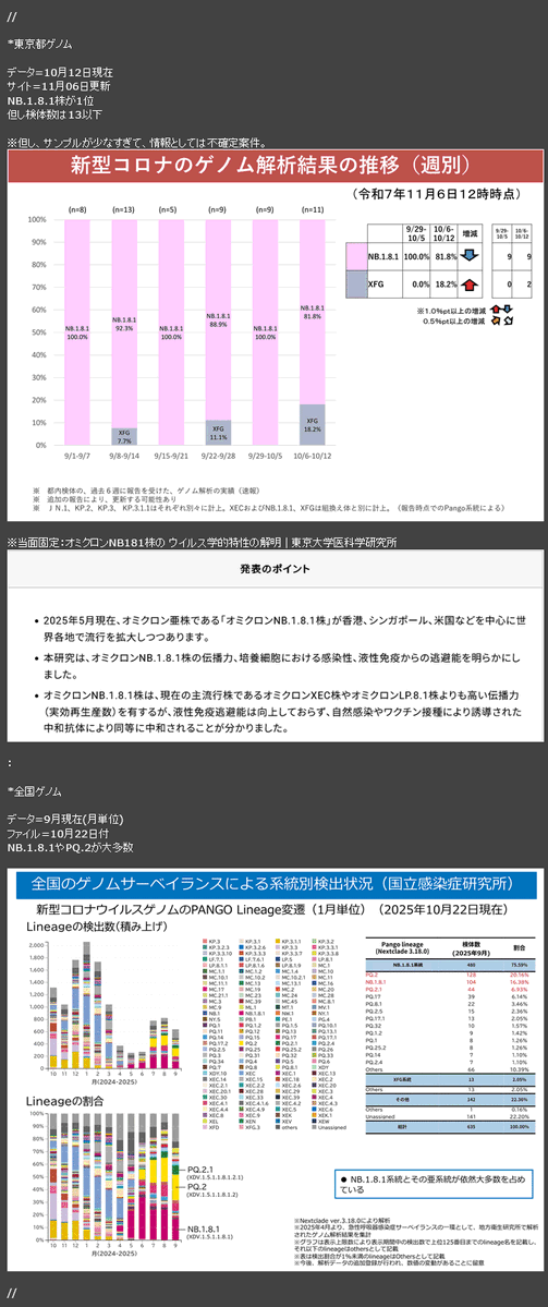 #COVID19 新型コロナ関連 ゲノム解析・推移 *東京都ゲノム データ=10月12日現在 サイト=11月06日更新 NB.1.8.1株が1位 但し検体数は13以下 *全国ゲノム データ=9月現在(月単位) ファイル=10月22日付 NB.1.8.1やPQ.2が大多数 pic.x.com/vpkoPAfd68