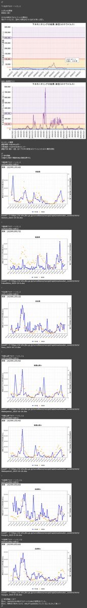 #COVID19 新型コロナ 下水サーベイ *更新状況と増減 基本的に日付は採取日・週一 *前回比:U増加 D減少 E横這い X不検出 N更新 札幌市11/09D インフル A=U B=X 相模川11/11DN グラフ11/04 山梨県11/11D 岩手県11/05U 小松市11/14DN 参考=青森10/20N 福島10/06 奈良10/13 和歌山10/18N 兵庫09/26 pic.x.com/4f4utNxlcn