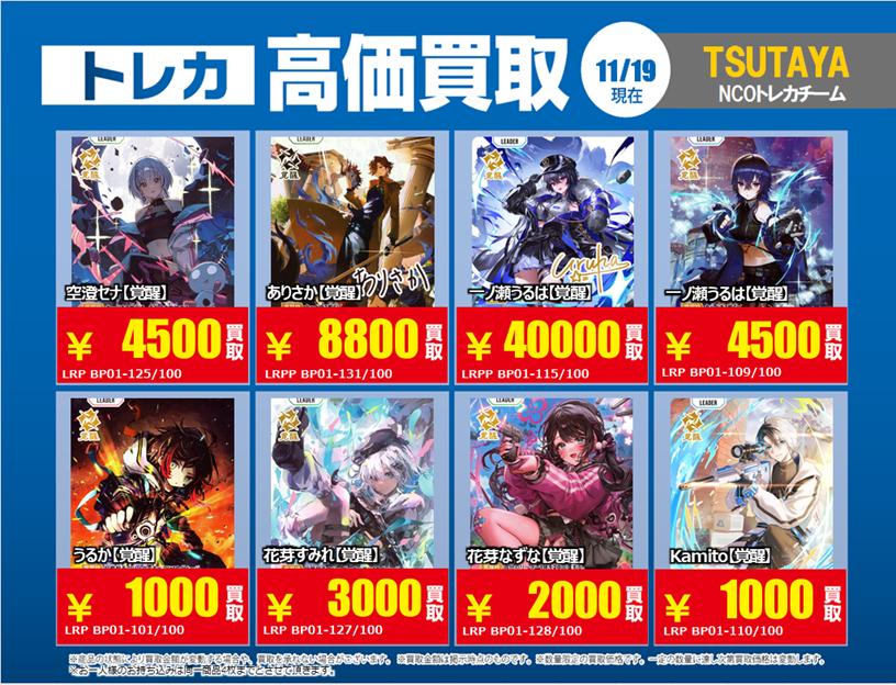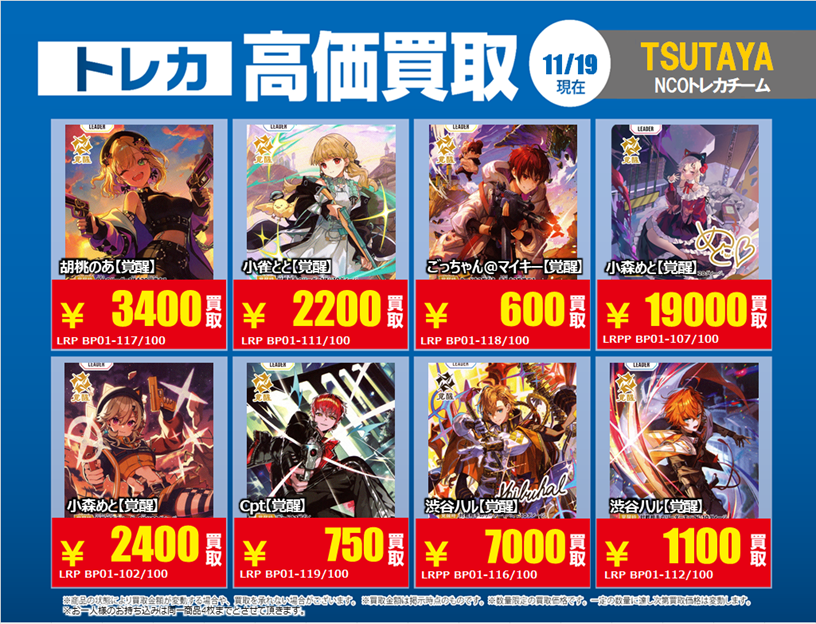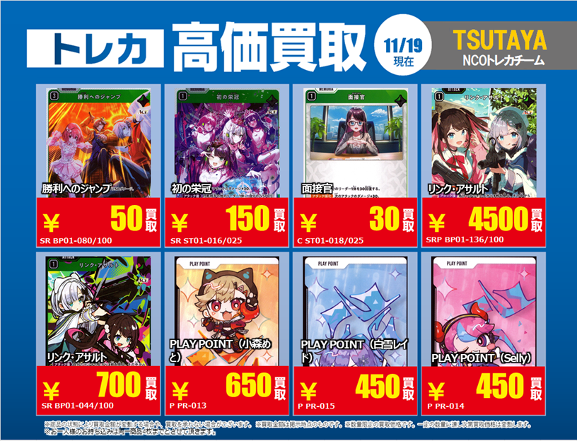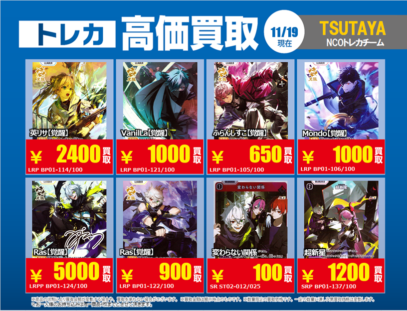 11/19更新「#XrossStars」3⃣ 💰高価買取情報まとめ💰 ※美品のみ対象です ※買取告知、その他買取カードの仕分けを事前にお願い致します #トレカ #TSUTAYA #クロスタTCG #買取 #ぶいすぽ #CR #NeoPorte pic.x.com/iOzbKAsVhg