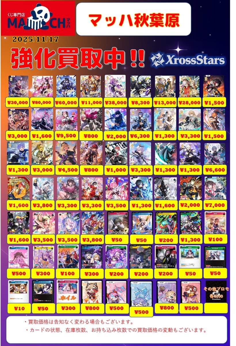 11/19更新「#XrossStars」2⃣ 💰高価買取情報まとめ💰 ※美品のみ対象です ※買取告知、その他買取カードの仕分けを事前にお願い致します #トレカ #TSUTAYA #クロスタTCG #買取 #ぶいすぽ #CR #NeoPorte pic.x.com/XB3mdBoail