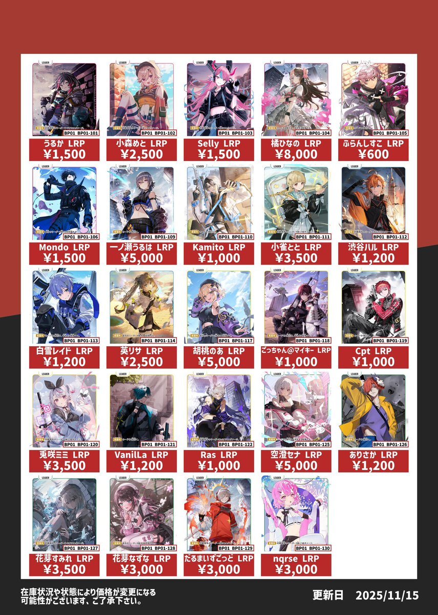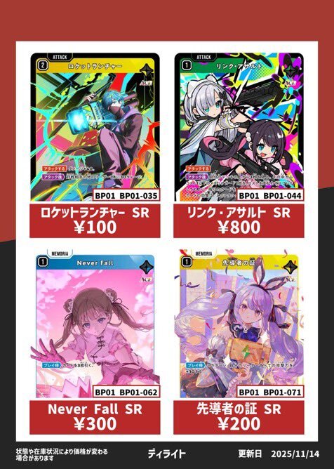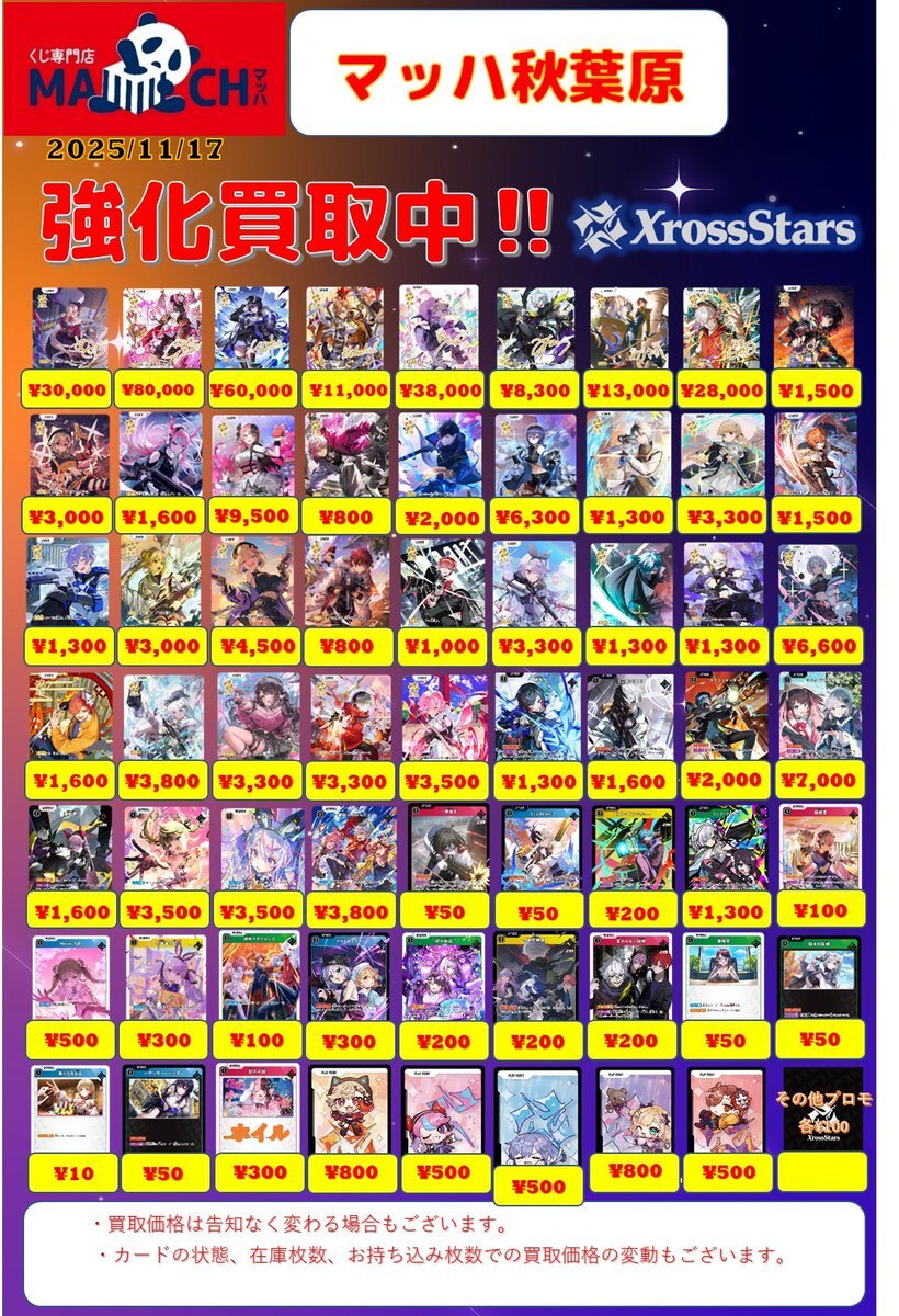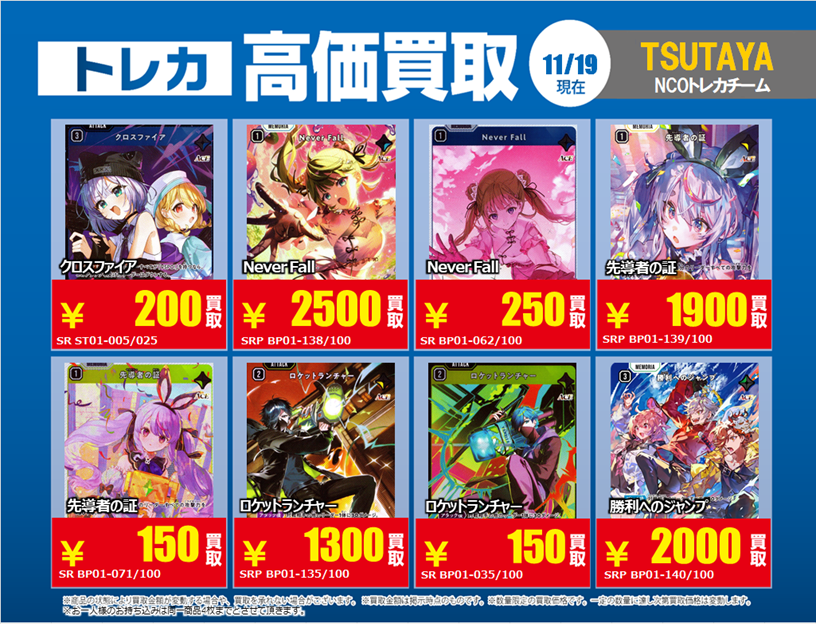 11/19更新「#XrossStars」1⃣ 💰高価買取情報まとめ💰 ※美品のみ対象です ※買取告知、その他買取カードの仕分けを事前にお願い致します #トレカ #TSUTAYA #クロスタTCG #買取 #ぶいすぽ #CR #NeoPorte pic.x.com/rBzX0Cy7gk