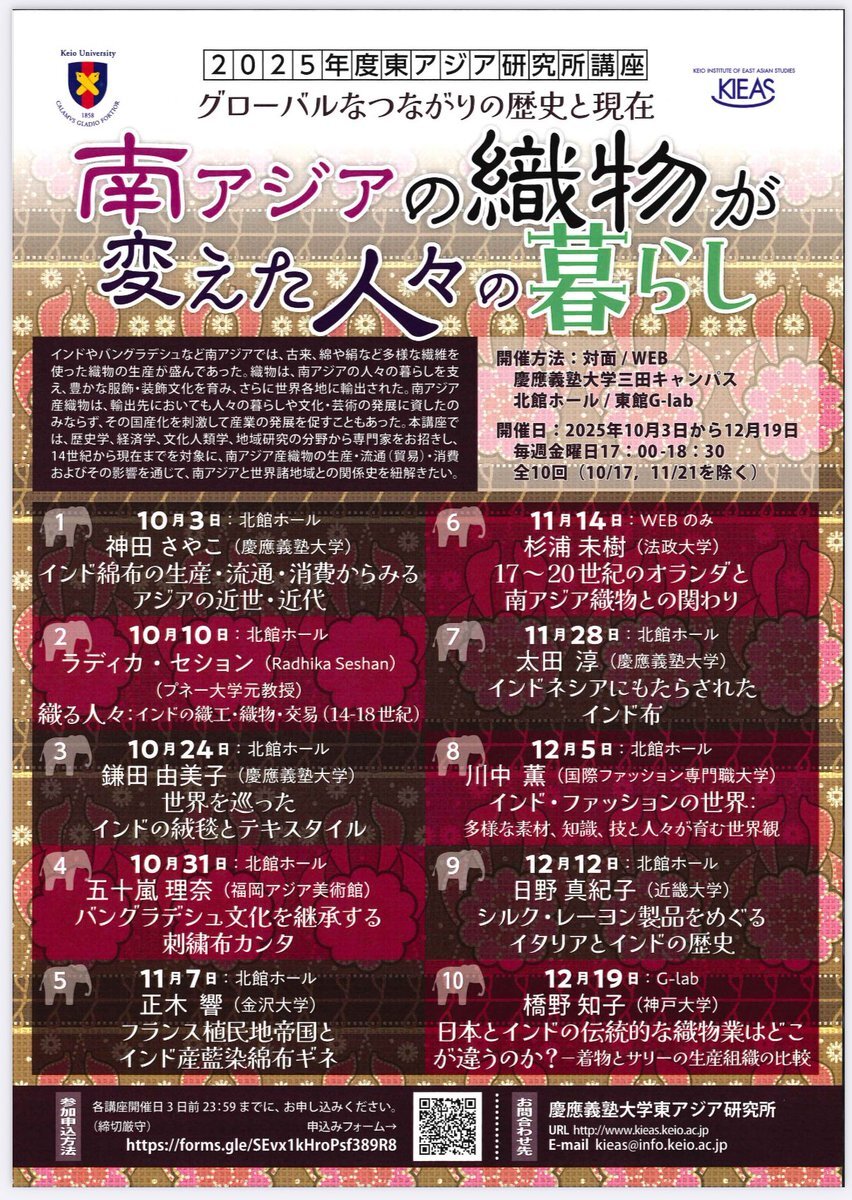 2025年度慶應義塾大学東アジア研究所講座(対面/WEB) 「南アジアの織物が変えた人々の暮らし:グローバルなつながりの歴史と現在」 全員10回 10月3日~12月19日(10月17日・11月21日を除く)毎週金曜日17:00~18:30 kieas.keio.ac.jp/lectures/index… 各回のテーマはこちら kieas.keio.ac.jp/8994dadb487622…