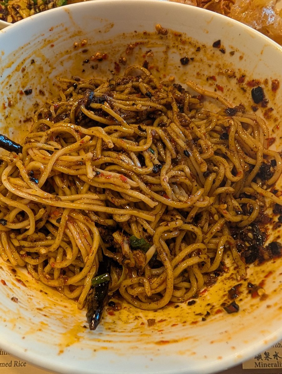 Power lunch last week at Yu in #CausewayBay #HongKong #銅鑼湾 香港 四川燃焼麺 Mouth numbing Sichuan sesame noodles. Mix mix mix... To coat all of that chili sauce! 香港では広東人用に辛く無い #四川料理 が出す店多い pic.x.com/C08hY5Lq00