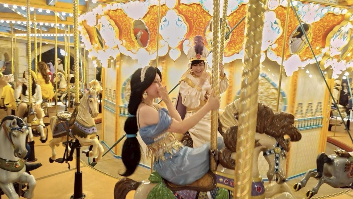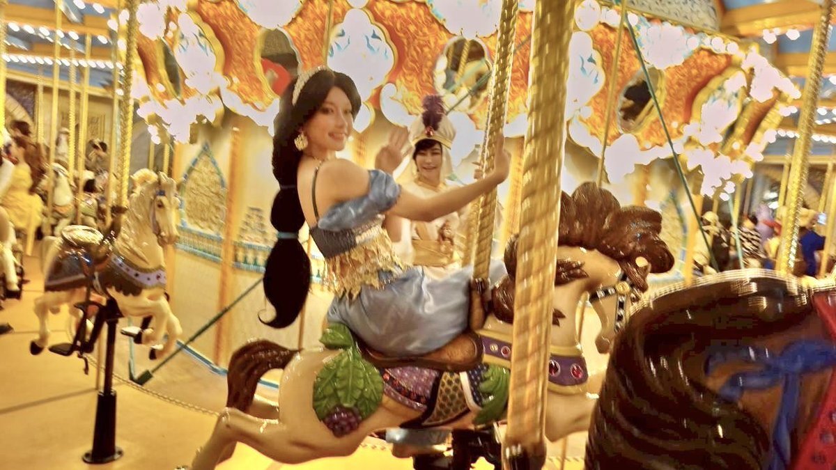 アラジン&ジャスミン カルーセルでデート🩵🎠✨ ほぉんとに幸せすぎて私完全にアルに恋するジャスミンだった (実はエリック、チャーミング、フィリップが3方向からカメラ構えてて現場めっちゃ面白い事になってた) #Dハロ仮装2025 #Dハロ仮装 pic.x.com/YlJmUncUZa
