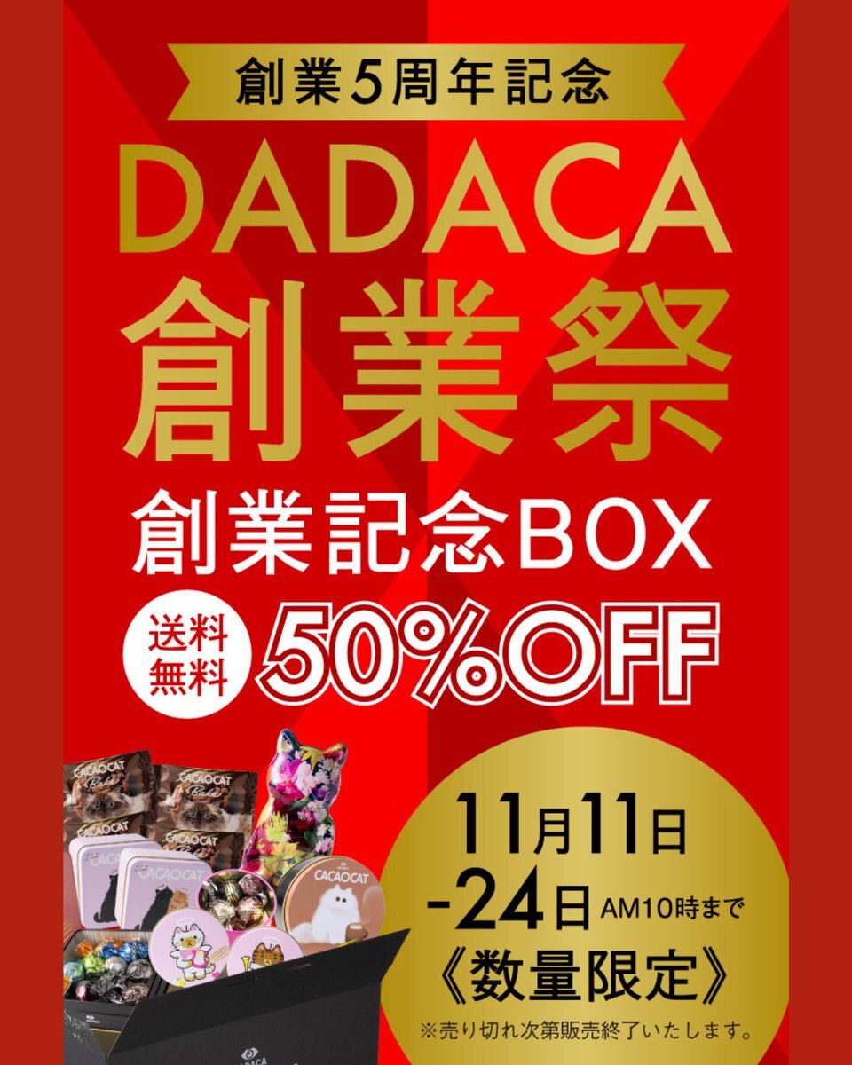 《再々入荷予定のお知らせ》㊗️🍫🐈⬛🐾 創業記念BOXについて、 第一弾に続き第二弾も予想を大きく上回るご注文をいただき、急遽【第三弾】の発売を開始いたしました😆🎉! さらに内容を変更しての発売でございます。どうぞよろしくお願いいたします✨ dadaca.online/products/set-2…