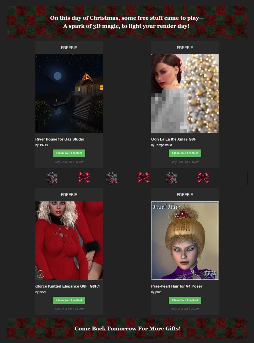 昨日、れんだろで貰った Ooh La La It's Xmas G8F メリークリスマスって書いておけばクリスマスの画とゆーコトになるんじゃないだろーか?🤔 #3DCG #DazStudio pic.x.com/qWuRRS6wuw x.com/ces3d0112/stat…