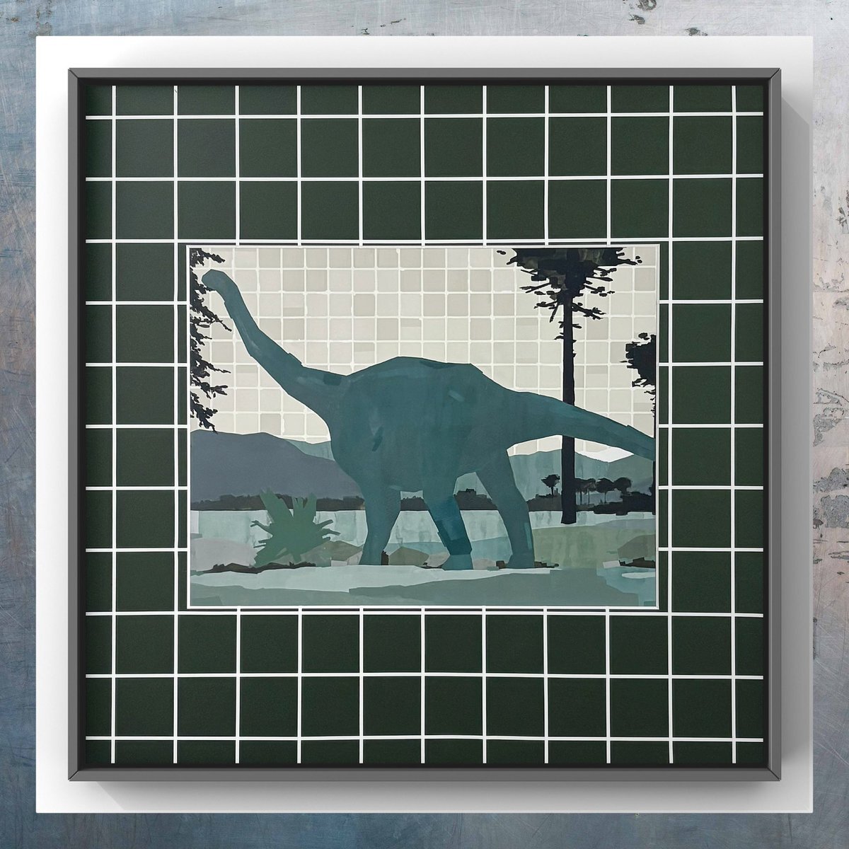 「Daydreaming」 2025 acrylic on paper 600×600 緑のマットにグリッドもつけました。 #painting #dinosaur pic.x.com/fSwbfQXcQy