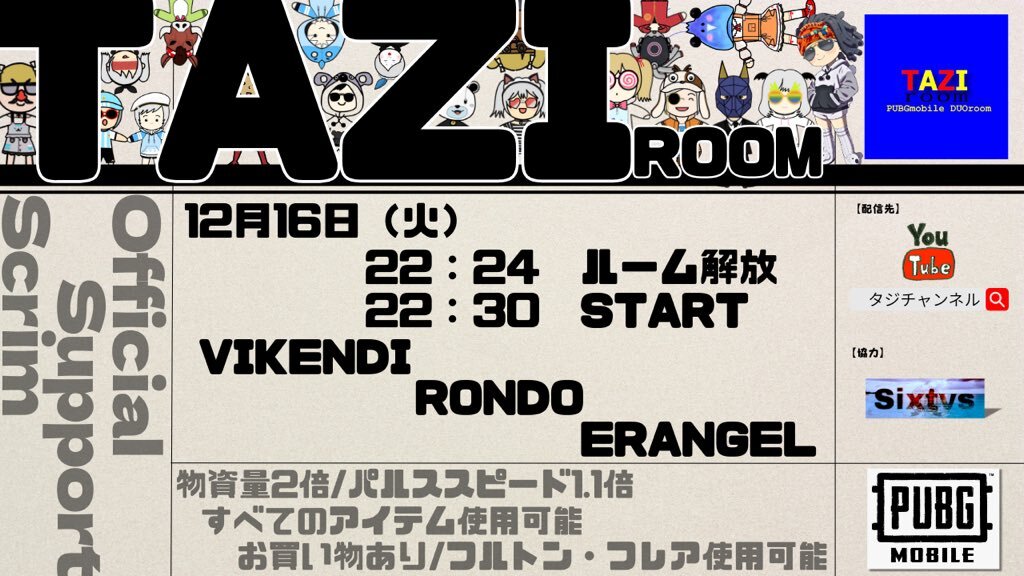 【次回告知】 🏵公式支援スクリム🏵 タジルーム(DUO) 12月16日火曜日22時24分ルーム解放 🎉定期開催🎉 毎週火曜日3戦! 全て自由参加型! YouTubeにて配信! 配信先:youtube.com/@tazichannel フォロー&通知オンお願いします☺️🎉 遊びに来てねー☺️ #PUBG_MOBILE #DUO #参加型 #タジルーム pic.x.com/F2AYPGTgx7