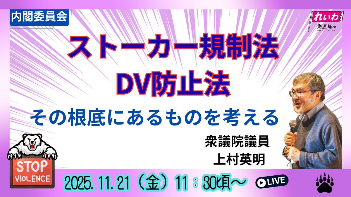朗報! #ストーカー規制法 #DV 11月21日 内閣委員会で、れいわ新撰組の上村秀明議員さんが質問! 時代の波に乗ってきた! 質問時間は11:30頃〜15分程度との事。 #上村秀明 x.com/1215hidepon/st…
