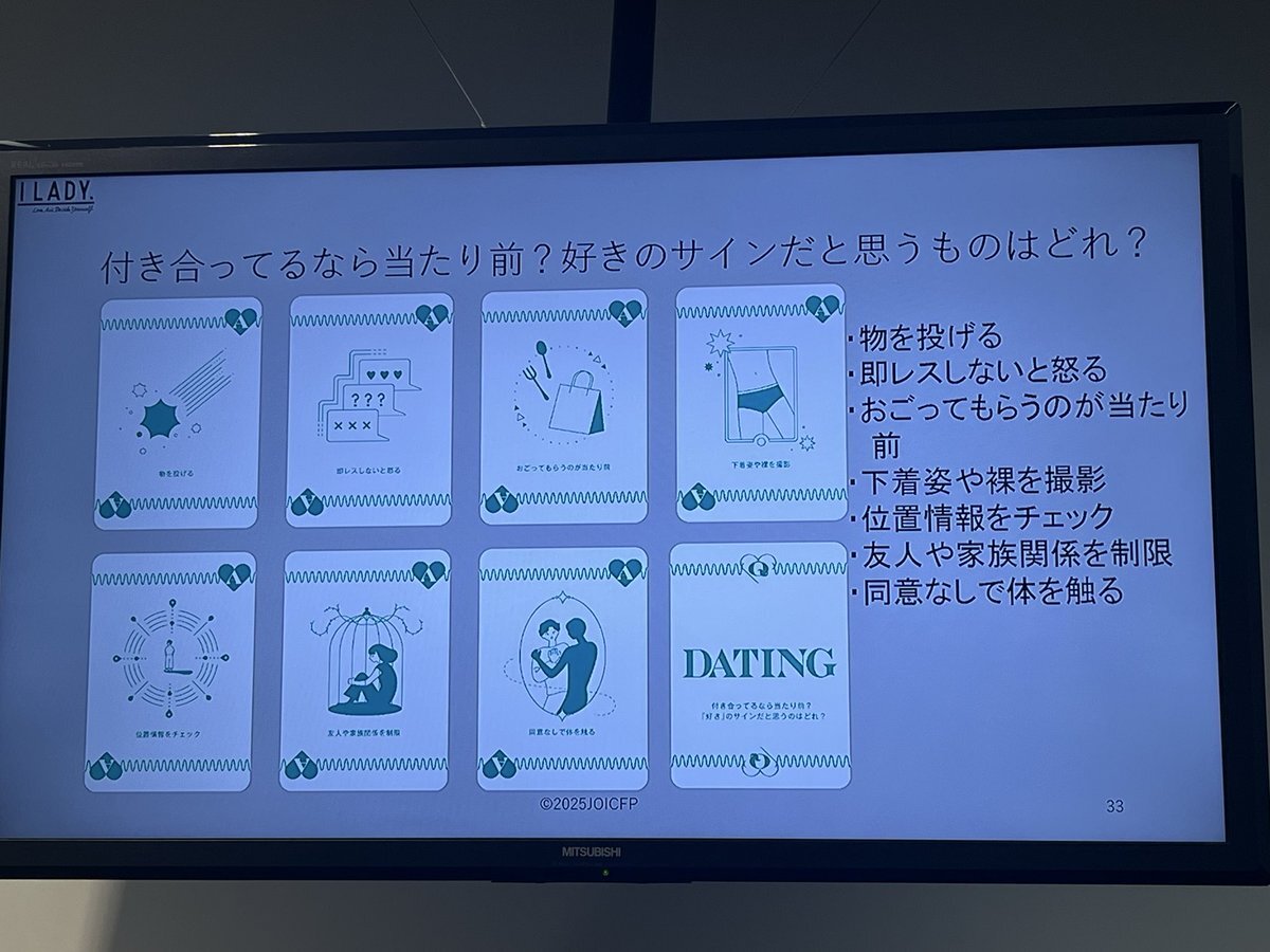 本日、国際協力NGOジョイセフさんが講義に来てくださいました!「位置情報をチェック、友達や家族の関係を制限」→これはデートDVです!相手を信じて自由を奪わないのが本当の愛😊健全な関係の線引きができるように、知識普及が大事ですね。ジョイセフさん、ありがとうございました😊#性行為 #DV pic.x.com/osWkhPsEVv