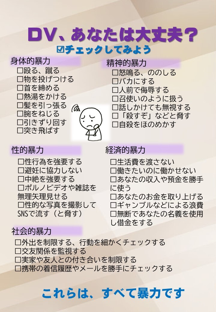 こんなお悩みありませんか? 「#DV #ドメスティックバイオレンス」 配偶者やパートナーからの暴力に困っている、怖い、支援情報が欲しいなど・・・ 一人で悩まず相談してみませんか? #大崎市 #電話相談 #面接相談 #メール相談 は24時間受付 相談フォームはHPより city.osaki.miyagi.jp/shisei/soshiki… pic.x.com/1Y7ZwTsIfz