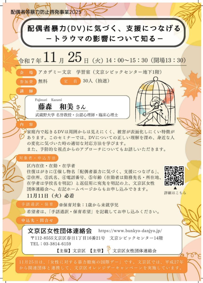無料セミナー「配偶者暴力(DV)に気づく、支援につなげる -トラウマの影響について知る-」を開催します。 ▼講師 藤森和美氏(武蔵野大学名誉教授・公認心理師・臨床心理士) ▼日時 11/25(火)14時~ ▼定員 30人(事前申込制)※手話通訳あり ▼申込はこちら bunkyo-danjo.jp/event.aspx?ID=…