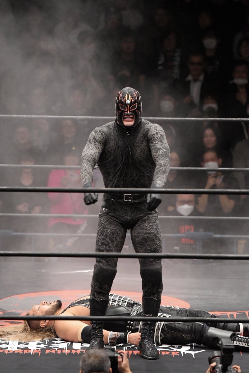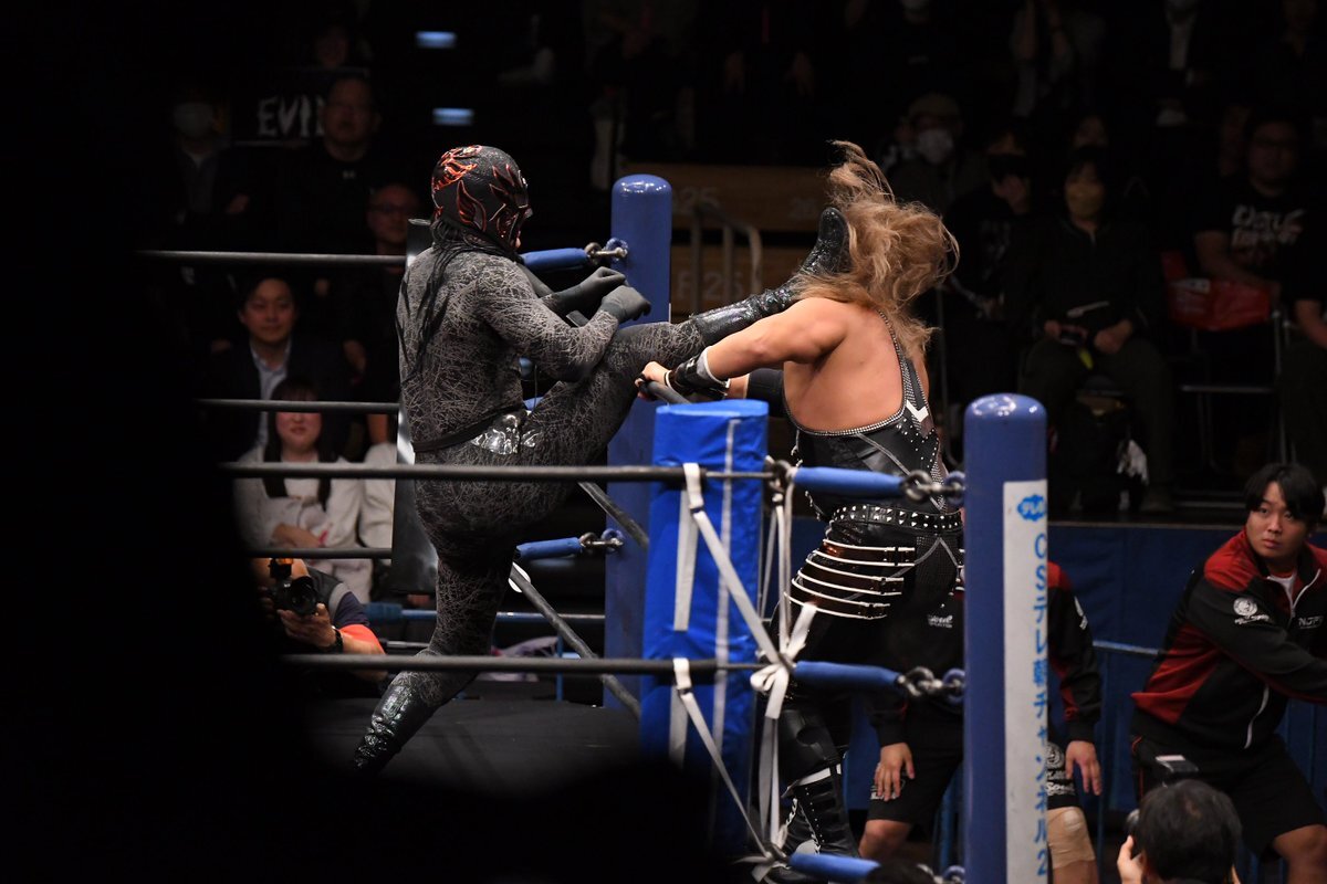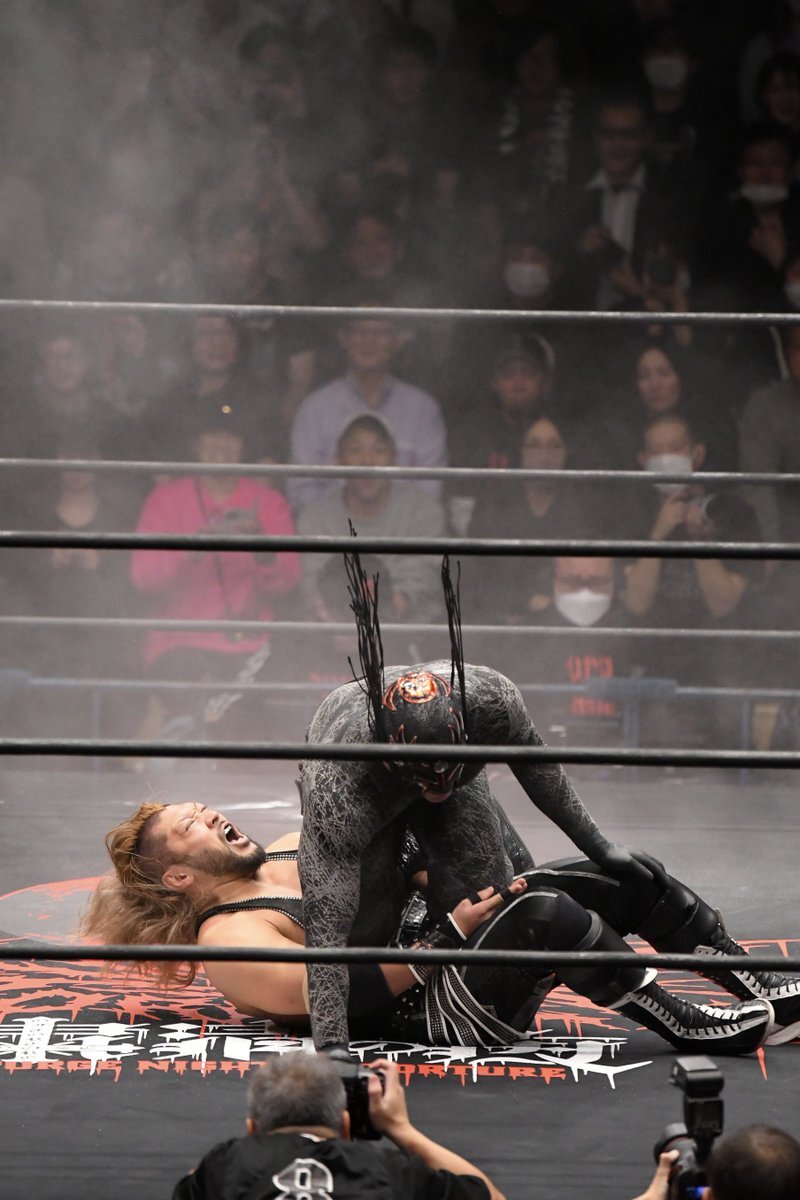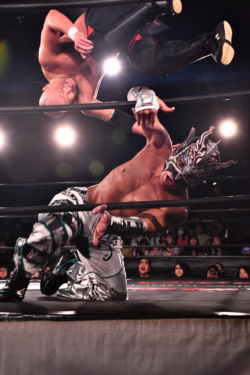 2025.11.19 #粛清の夜 後楽園ホール 第1試合 EVIL vs シュン・スカイウォーカー シュン選手が逆にEVIL選手にEVILを! (形としては上野選手のWRに似た形でした) #njpw #dragongate #SHUNSKYWALKER pic.x.com/YuXcgSLMOC
