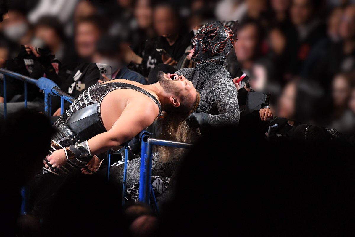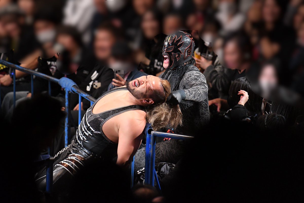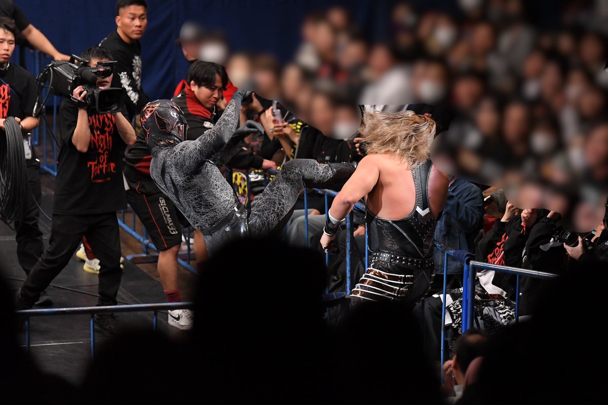 2025.11.19 #粛清の夜 後楽園ホール 第1試合 EVIL vs シュン・スカイウォーカー 場外でシュン選手がEVIL選手にバイシクルキック!EVIL選手の髪の毛を掴んでご満悦なシュン選手。鉄柵をガシャンガシャンと揺らしまくりで興奮されてました… #njpw #dragongate #SHUNSKYWALKER pic.x.com/0cBdW5BUTh