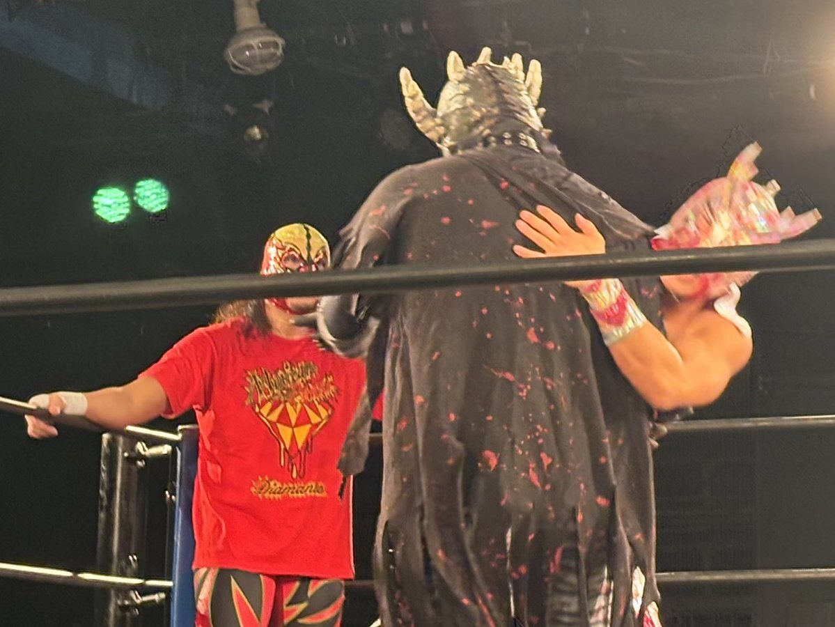 Part5 最後はかつてのマスカラ戦の再現でダイヤが敗北 試合後、シュンはああだこうだ言い訳してダイヤのマスクを剥ごうとするもインフェルノ(吉岡)が阻止! もう争ってたあの時とは違うのだ 最後は豹が「R・E・Dは100点!」で締め #DRAGONGATE pic.x.com/nSaK9OyHgP x.com/gotohell2008/s…