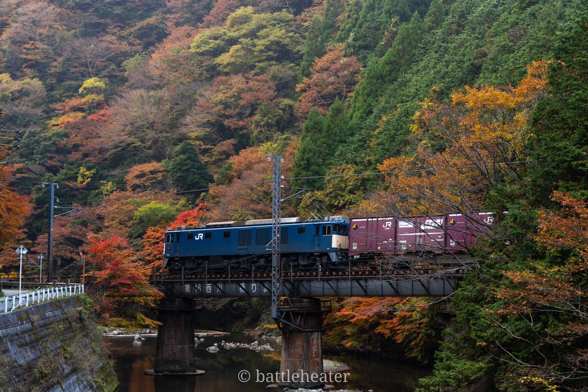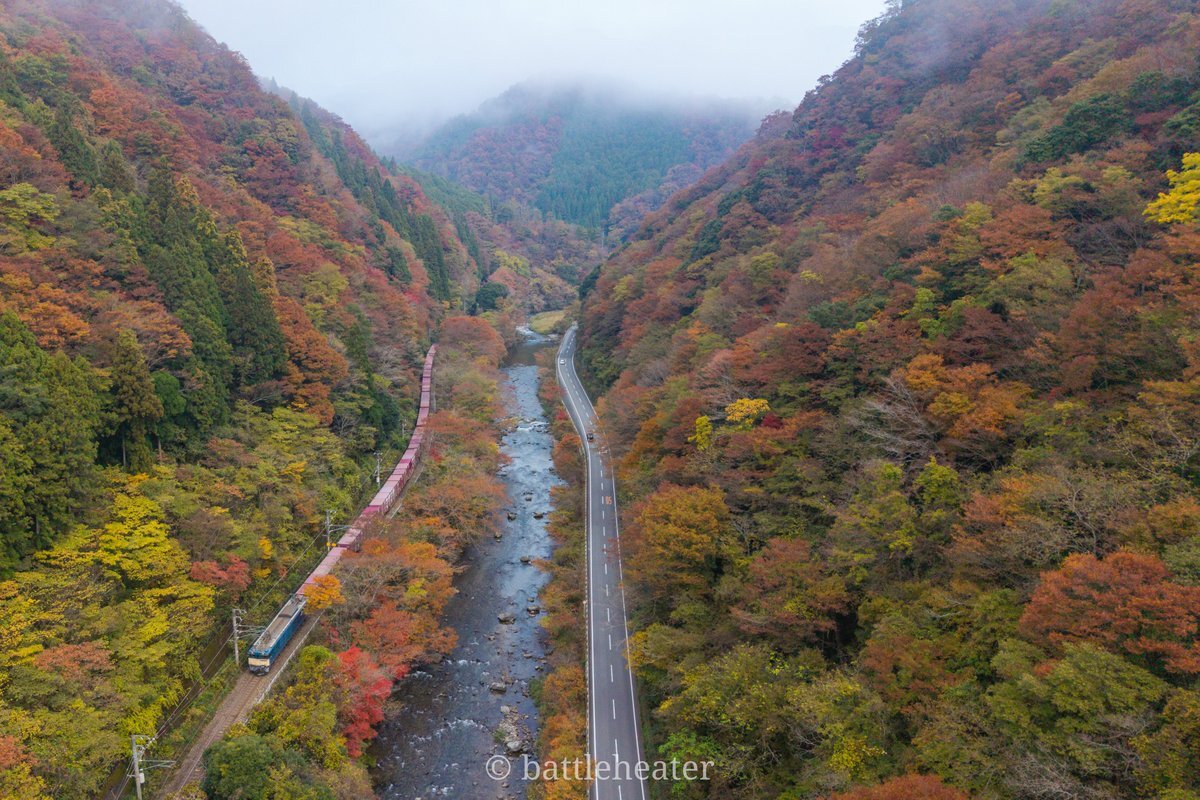 鮮やかな紅葉に包みこまれ、川の流れのように走るEF64貨物列車 今年の紅葉は終わりつつありますが、どうか来年もこの素晴らしき風景の中に、ロクヨンセンがいてくれますように願うばかりです #EF64 #DronePhoto pic.x.com/VNWVpKbq2m